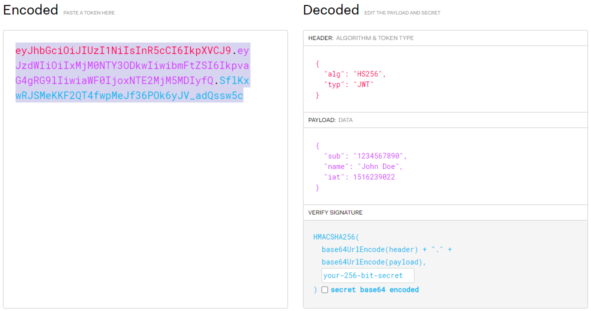 위 예제에서 sub & iat는 등록된 클레임(Registered Claims)이며, name은 사용자 정의 클레임이다. 등록된 클레임의 사용 또한 옵션이므로 nbf 처럼 특정 활성시간이 필요하지 않다면 제외시킬 수 있다.