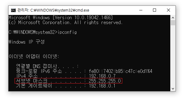 네트워크의 마지막 IP = 192.168.0.225