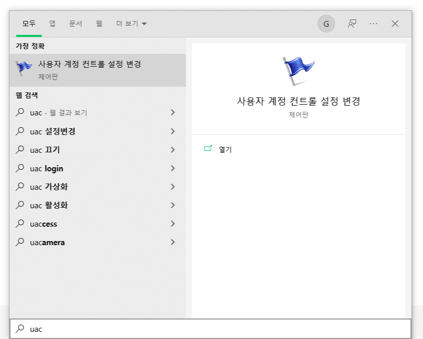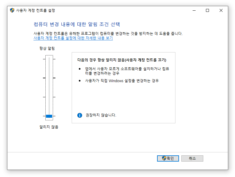 알리지 않음(사용자 계정 컨트롤 끄기) 설정