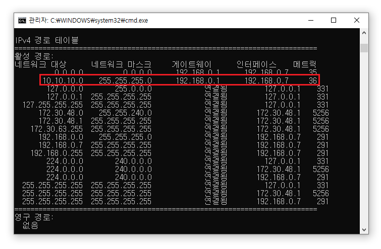 -p 옵션 입력 시 '활성경로' 가 아닌 '영구경로' 에 생김