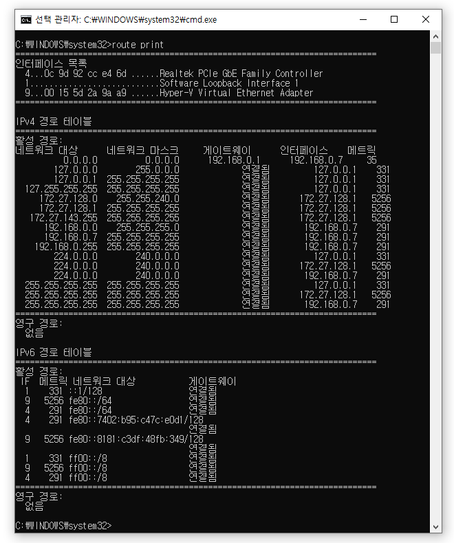 WSL 사용자의 경우 Hyper-V 가상 랜카드를 사용하기 때문에 라우팅 설정이 필수적이다. 심지어 WSL은 부팅 시 매번 ip가 바뀌는 유동IP를 가지고 있기 때문에, 이를 고정시켜줄 수 없어 부팅할 때 마다 매번 라우팅을 설정해줄 필요가 있다. 해당 과정을 진행하기 앞서 윈도우에서 라우팅 테이블 설정하는 방법에 대해 우선적으로 알아보았다.