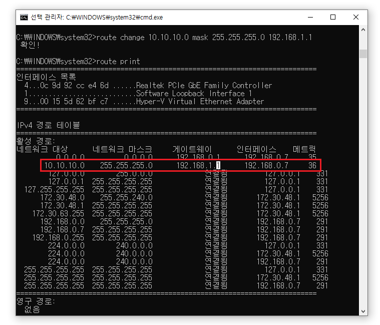 $ route change 10.10.10.0 mask 255.255.255.0 192.168.0.7 -p
