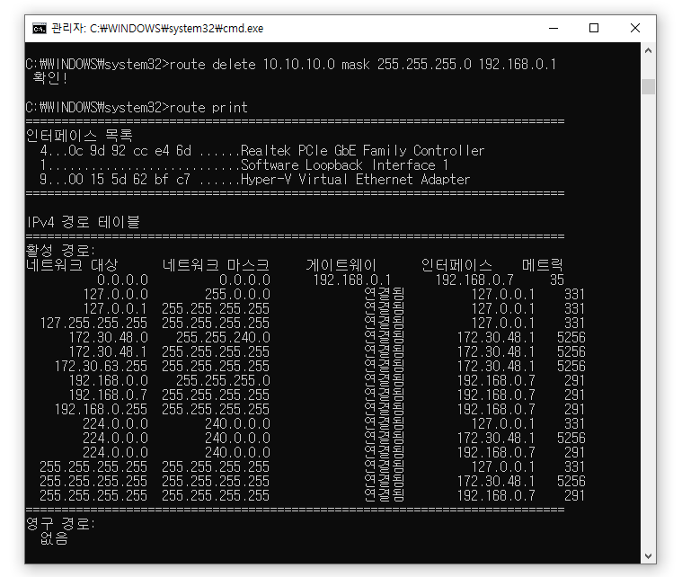 // route delete [네트워크 대상] mask [네트워크 마스크] [게이트웨이] if [인터페이스] [옵션]