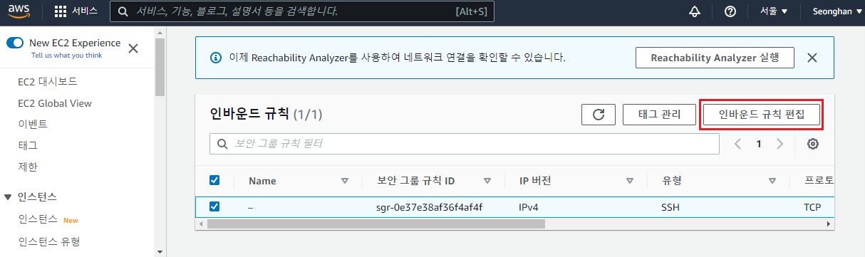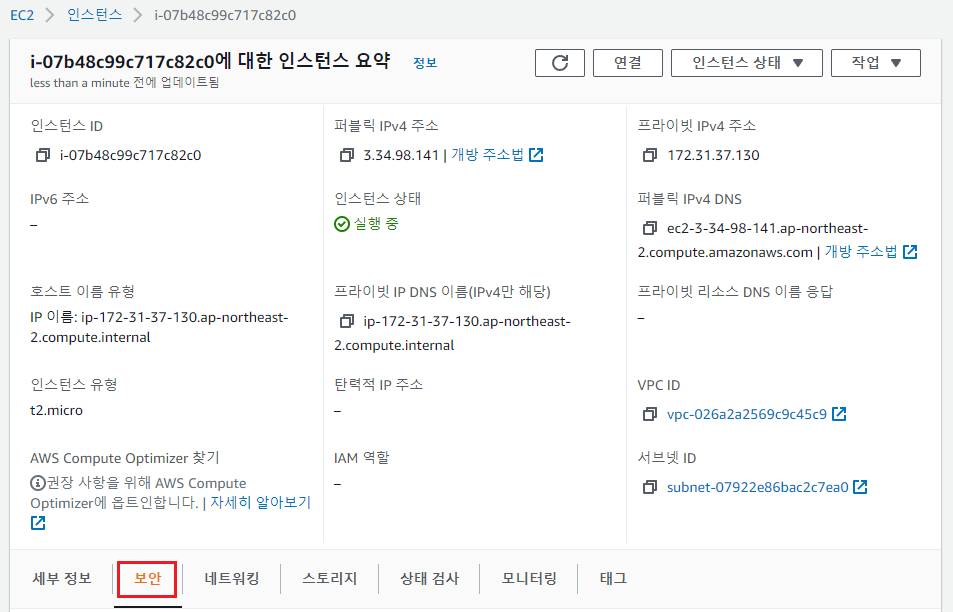 인스턴스 요약 페이지 하단 보안 탭 클릭