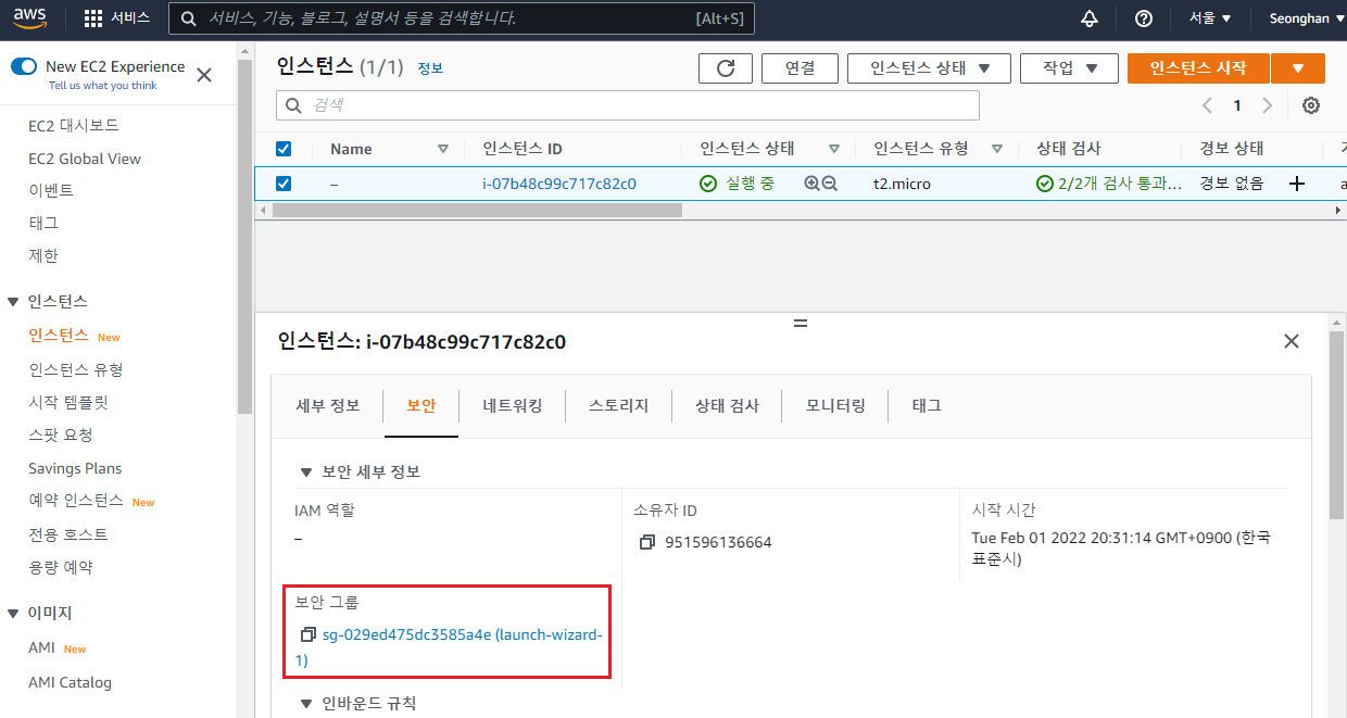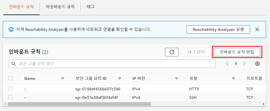 인스턴스 보안 탭 > 보안 그룹 > 하단 인바운드규칙의 인바운드 규칙 편집 버튼 클릭