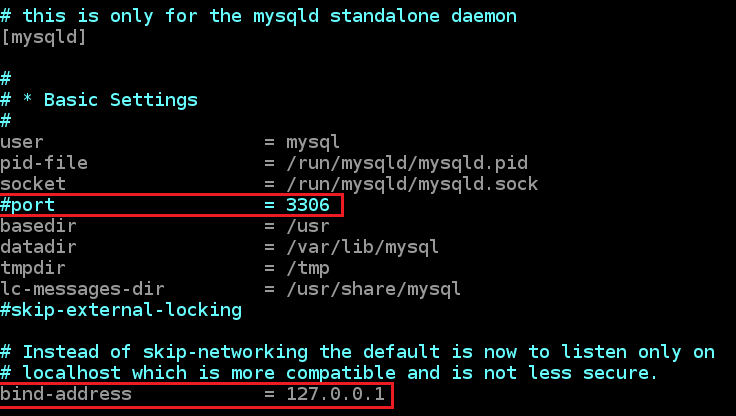 설정파일을 보면 port가 주석처리 되어있다. 기본적으로 3306 포트를 사용하고 있어서인데, 풀어서 다른 포트를 사용해도 상관없다. 나는 뭐가 되었건 설정이 되어있는게 좋아서, 주석 해제한 뒤 3306 포트 그대로 사용할 수 있도록 두었다. bind-address는 반드시 바꿔줘야만 한다. 127.0.0.1은 말 그대로 localhost에서만 접속이 가능하다는 의미이니 0.0.0.0 으로 바꿔주도록 하자.