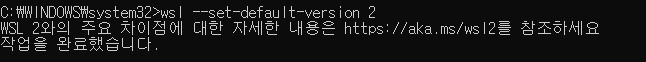윈도우 WSL 기능을 사용하도록 설정하고, 리눅스 커널(Kernel)을 최신 버전으로 업데이트까지 했으니, 이제 해야할 건 방금 설정한 WSL을 기본값으로 설정하는 것이다. 만약 해당 명령어를 입력 시 가상 머신 플랫폼 windows 기능을 사용하도록 설정하고 bios에서 가상화를 사용하도록 설정되어 있는지 확인하세요. 라는 에러가 출력된다면, PC 혹은 노트북의 CPU가 가상화 기능을 제공하지 않는 제품이거나... 아니면 재부팅을 하지 않았거나 둘 중 하나이다.