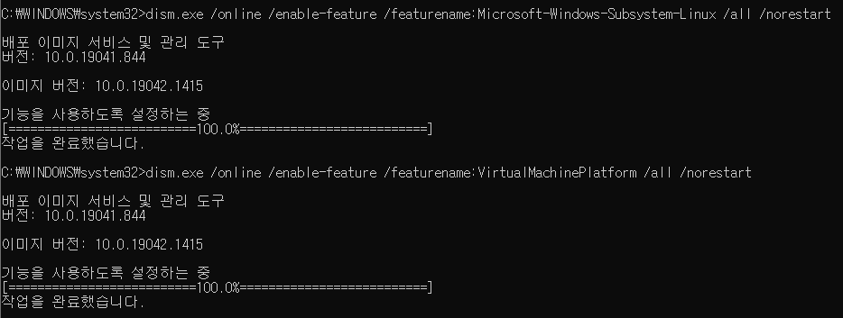명령어 실행을 성공적으로 마쳤다면 PC 재부팅이 필요하다. 반드시 해야하므로 먼저 하고 오자.