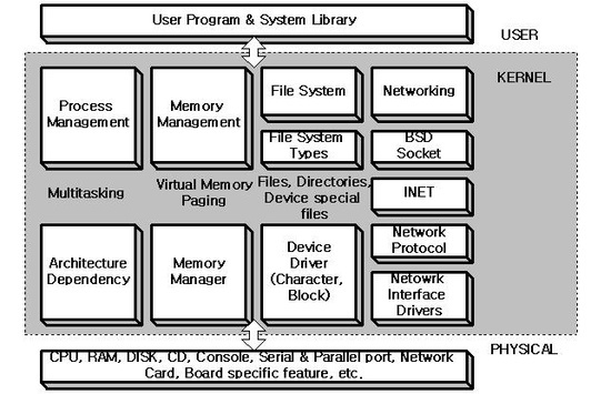 커널(Kernel)이란 PC의 운영체제의 핵심부로, PC의 물리적 자원을 관리하는 역할을 수행한다. 여기서 말하는 물리적 자원이란 CPU, Memory, Disk, Network 등을 의미한다. 즉 CPU와 Memory를 얼마나 할당하고 Disk 용량을 어느정도 확보하고 Newtwork 소켓을 어떻게 사용하는지 등을 관리한다고 보면 된다.