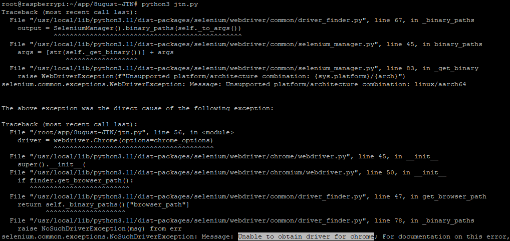 라즈베리파이 환경에서 Git에 있는 Python Selenium 레파지토리를 Pull 받아서 실행시켰더니 다음과 같은 오류가 발생했다. Selenium4 버전을 사용하고 있어서 별도의 Chromedriver가 필요없는 상황. 라즈베리파이에서는 Selenium을 사용할 수 없는걸까? 하고 두려움이 밀려오던 찰나, 다행스럽게도 원인을 파악하고 해결을 완료하여 그 내용을 기재해보고자 한다.