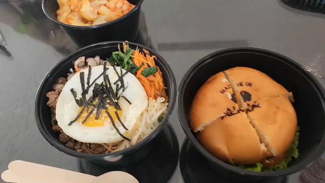 알마버거, 스테이크비빔밥, 해물떡볶이를 시켰는데